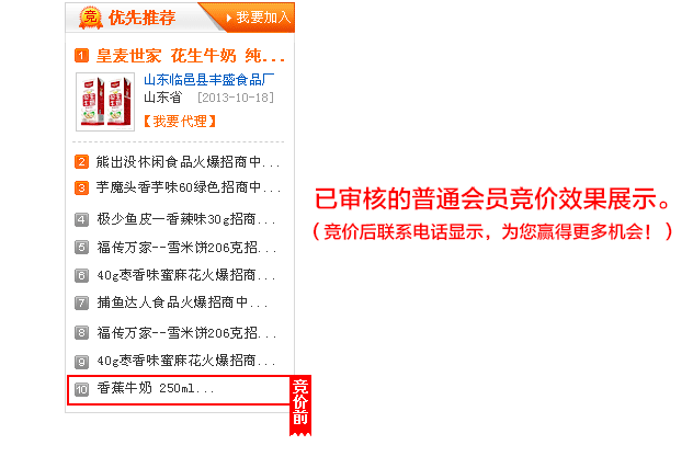 竞价排名是一种按效果付费来推广自己所发布产品的服务,服务对象为所有通过审核的食品网会员。用户在食品网上发布的产品信息都可以通过金信币进行竞价,参与竞价的企业产品信息在招商列表页、产品库、搜索列表页中比同类的信息排名靠前,用少量的投入就可以带来大量的潜在客户。竞价排名结果完全按照用户访问数量计费,没有客户点击访问不计费,可以灵活控制推广的力度和资金投入。
